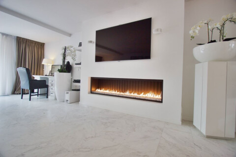 Lichte en ruime woonkamer aan de achterzijde met marmeren vloer en een prachtige Boley openhaard. Toegang tot de zonovergoten tuin (120m2) op het zuiden.